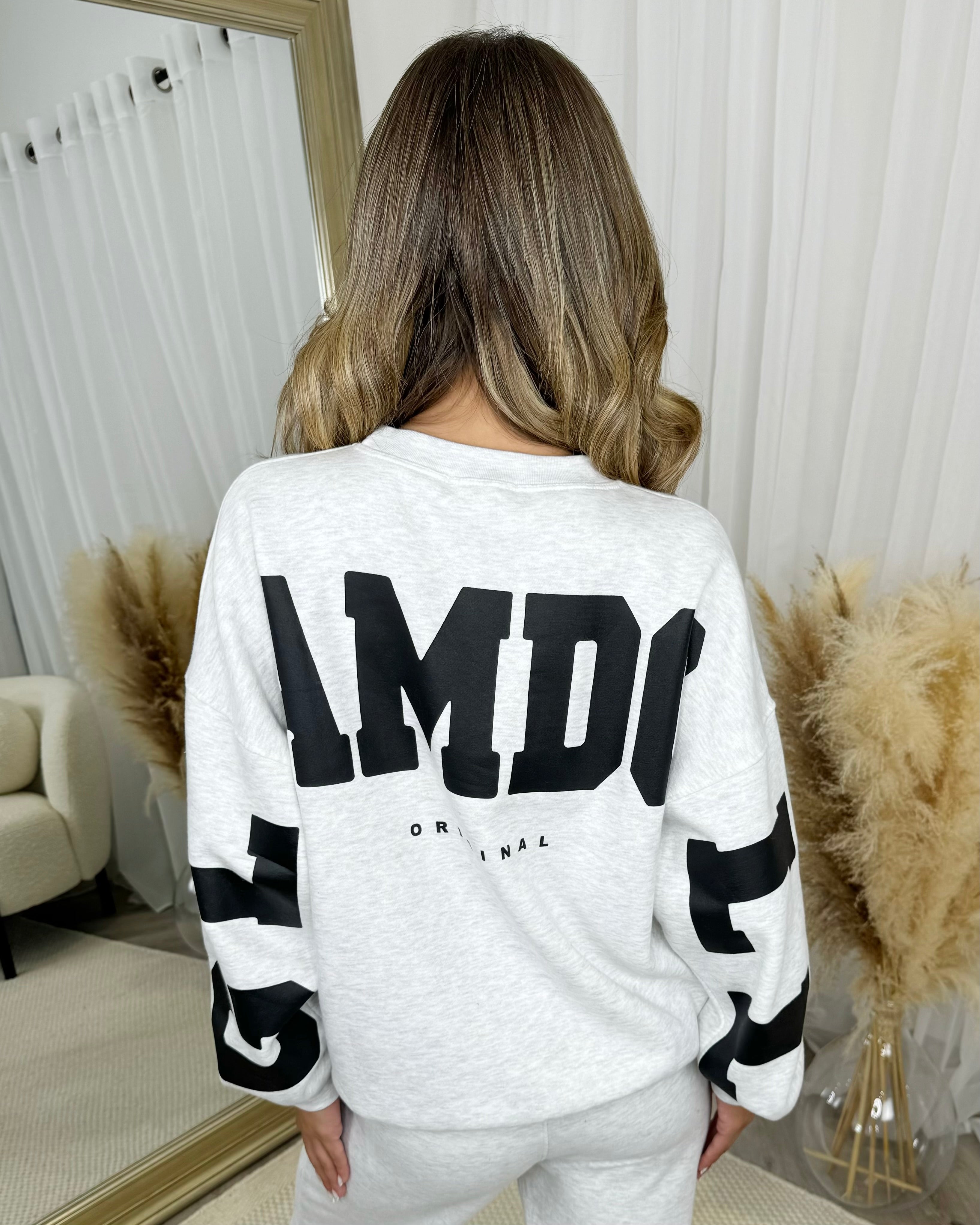 Alanna Round Neck 'GLAMDOLL' Back Print Fleece Lined Jumper - Bleach Grey