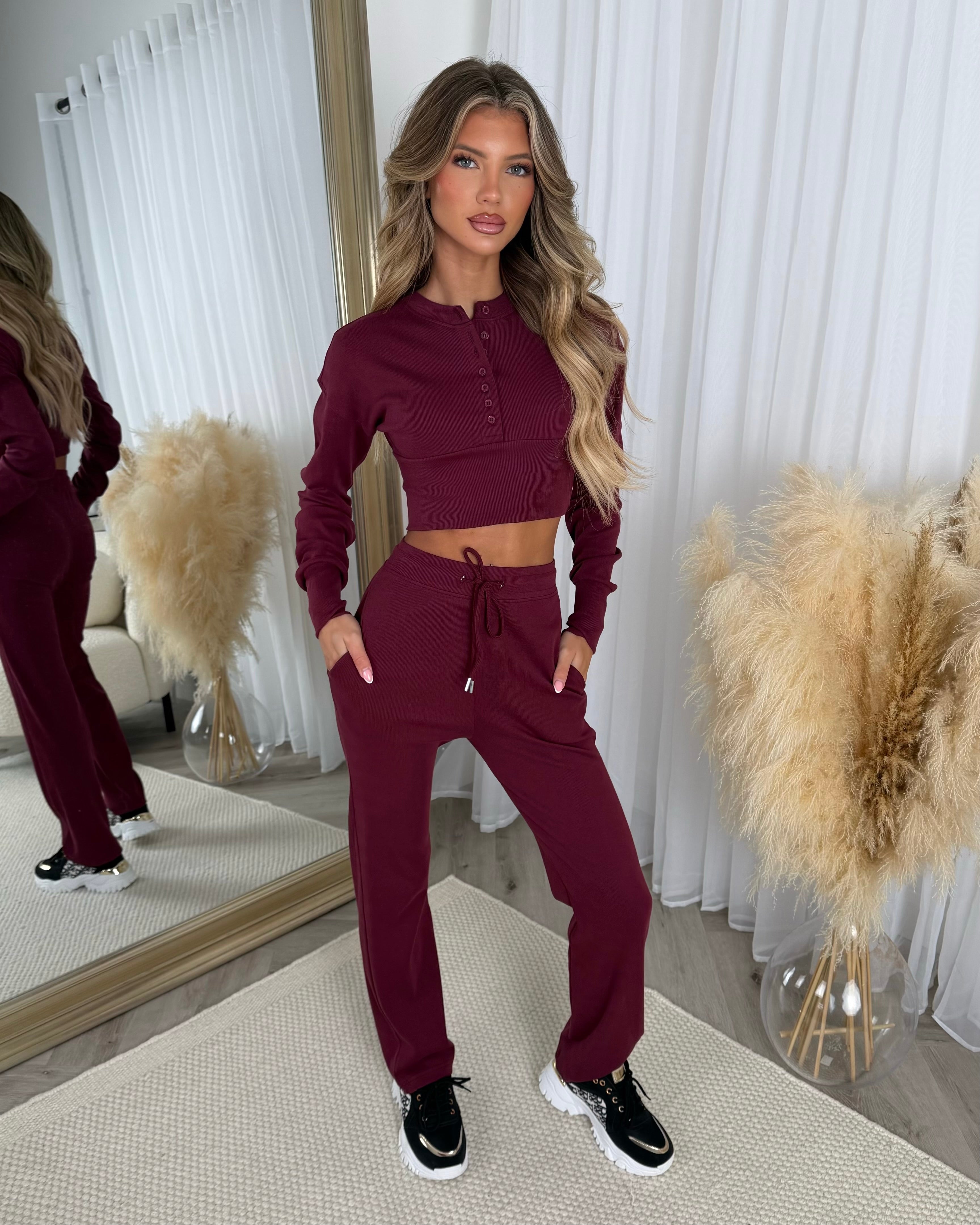 Eliza Ribbed Round Neck Button Up Corset Style Top & Trouser Set - Wine