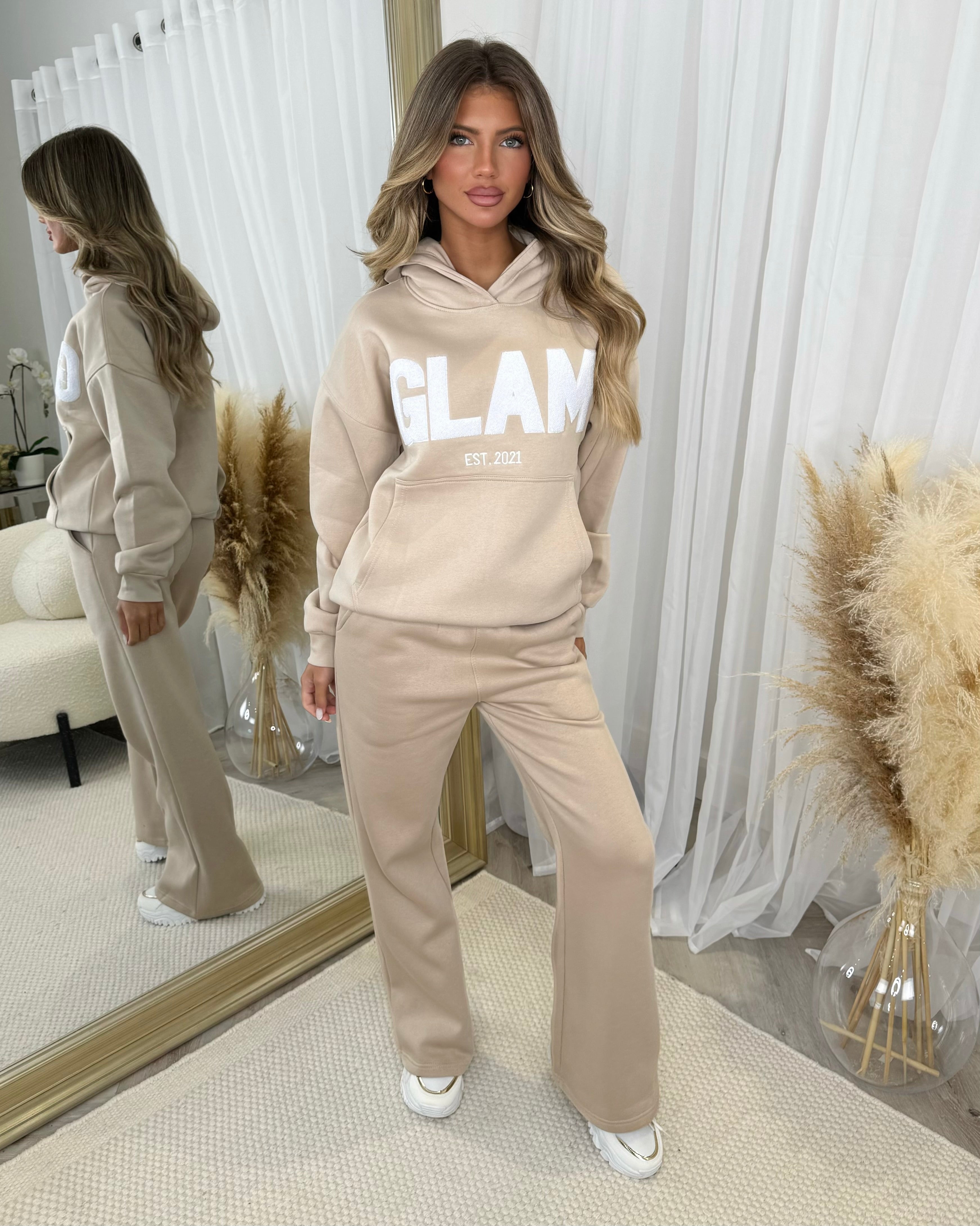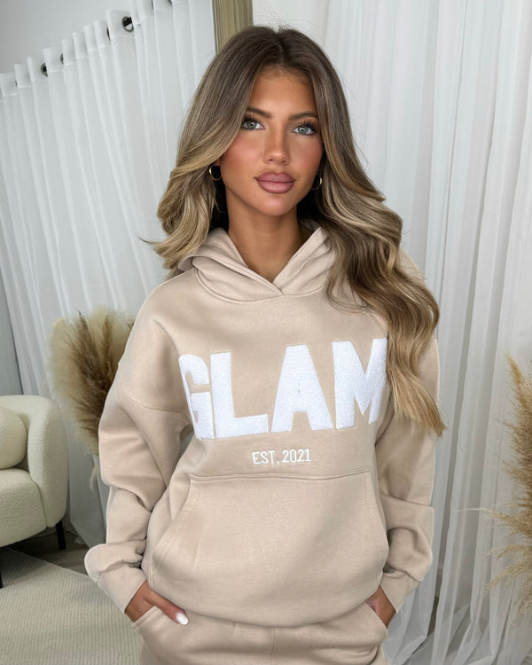 Millie 'GLAM' BOLD EMOBROIDERY Front Logo Print Hoodie - Beige