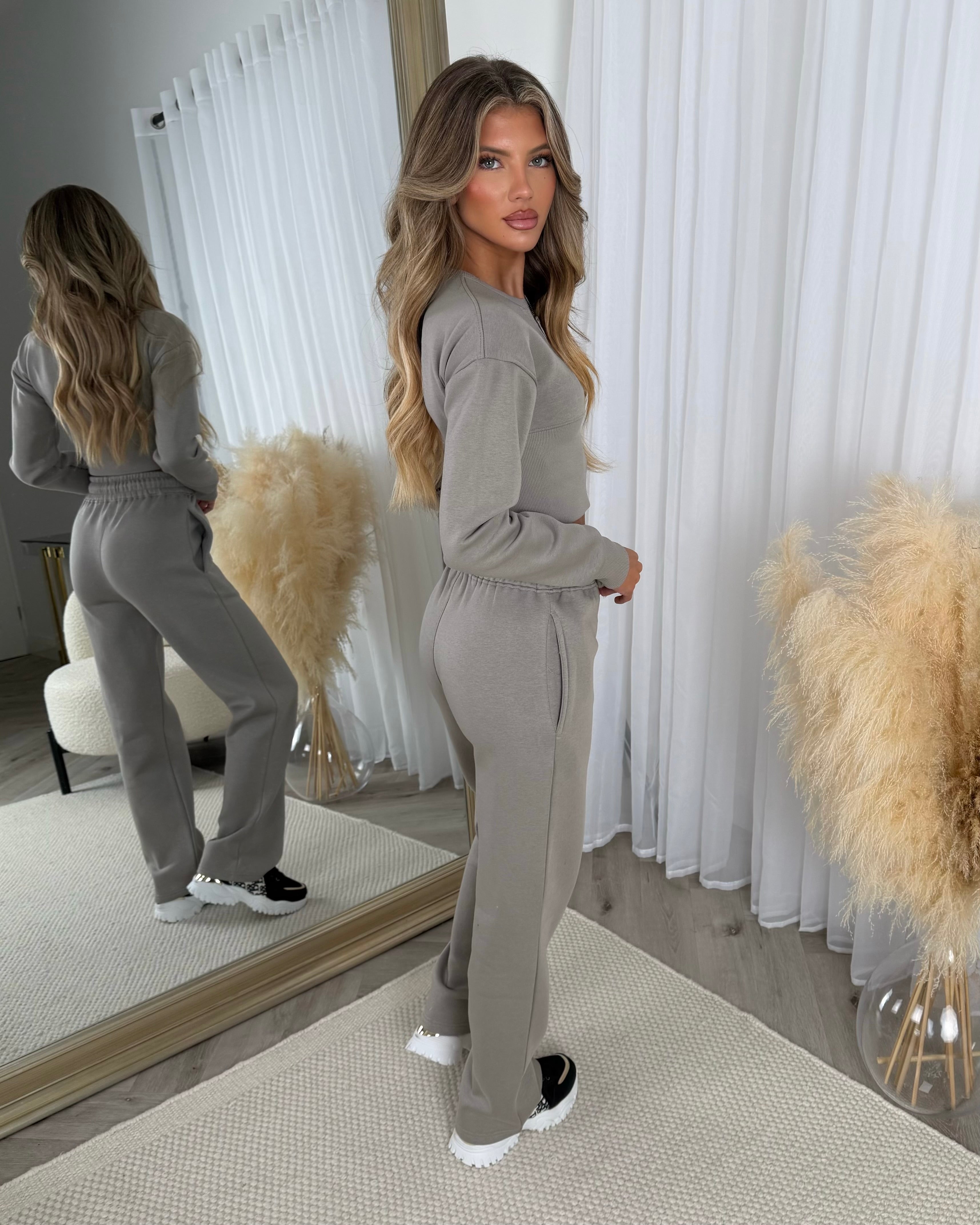 Sienna Round Neck Cropped Corset Zip Top & Straight Leg Trouser Set - Dove Grey