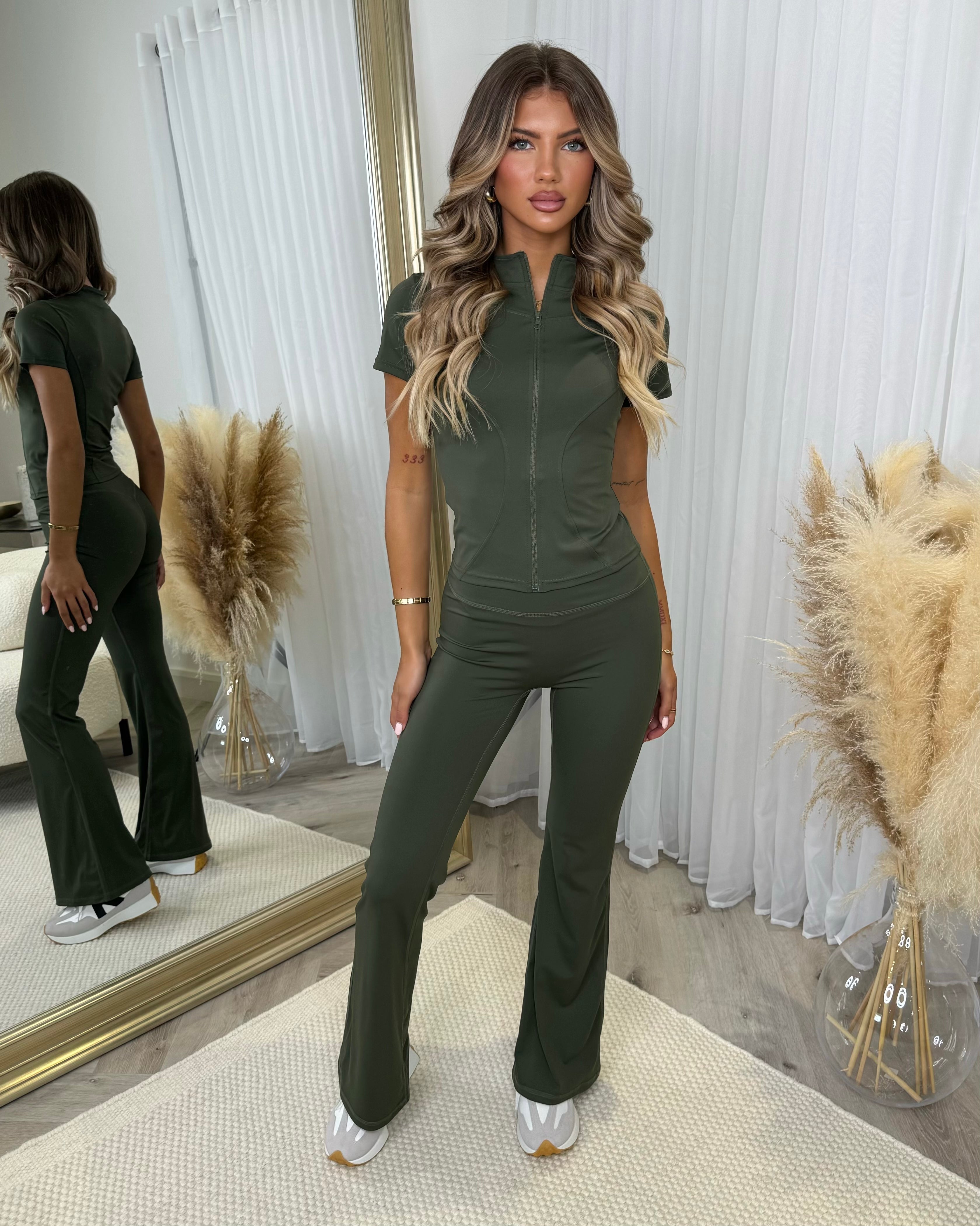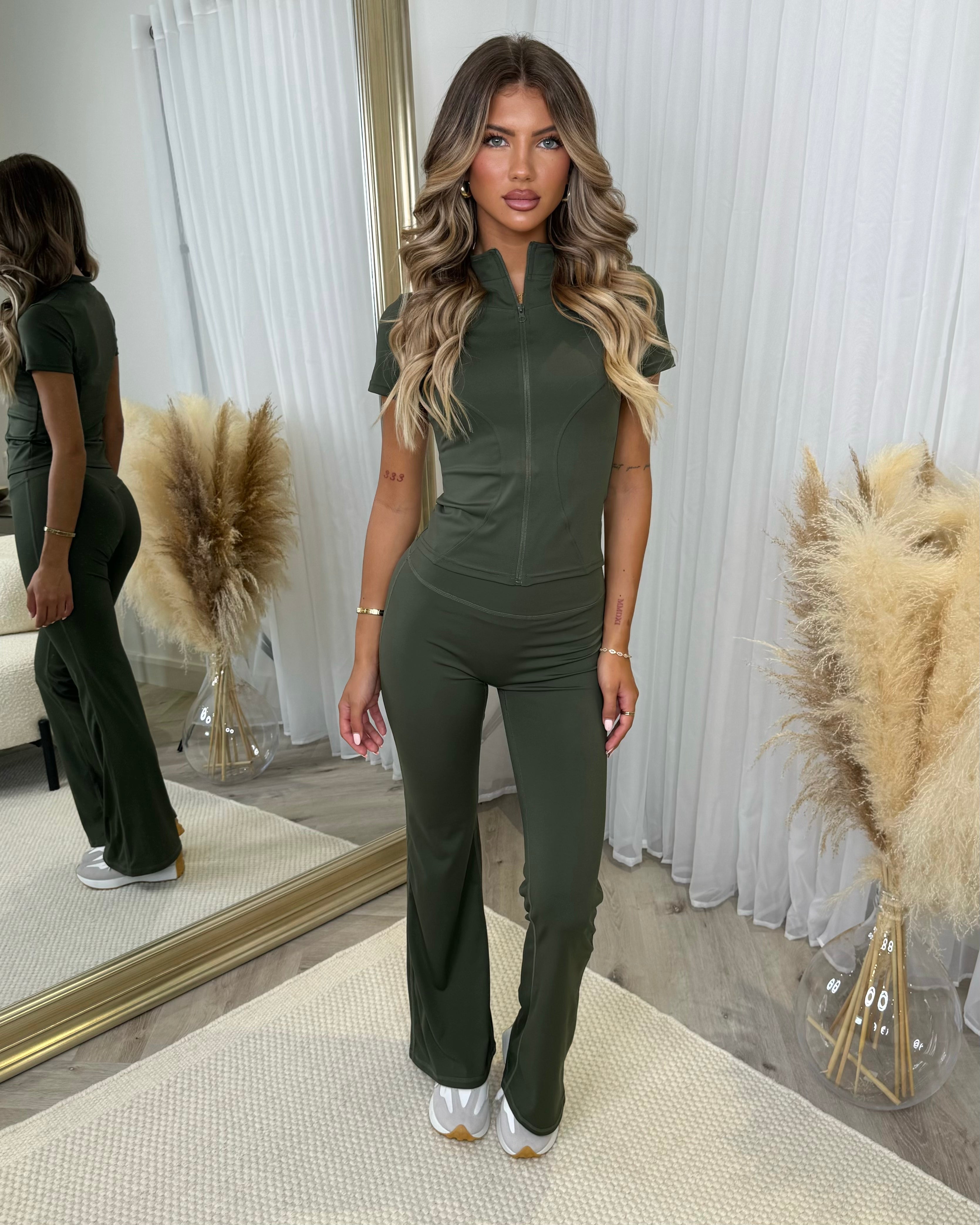 Tessa Two Piece Zip Top Gym Set- Khaki